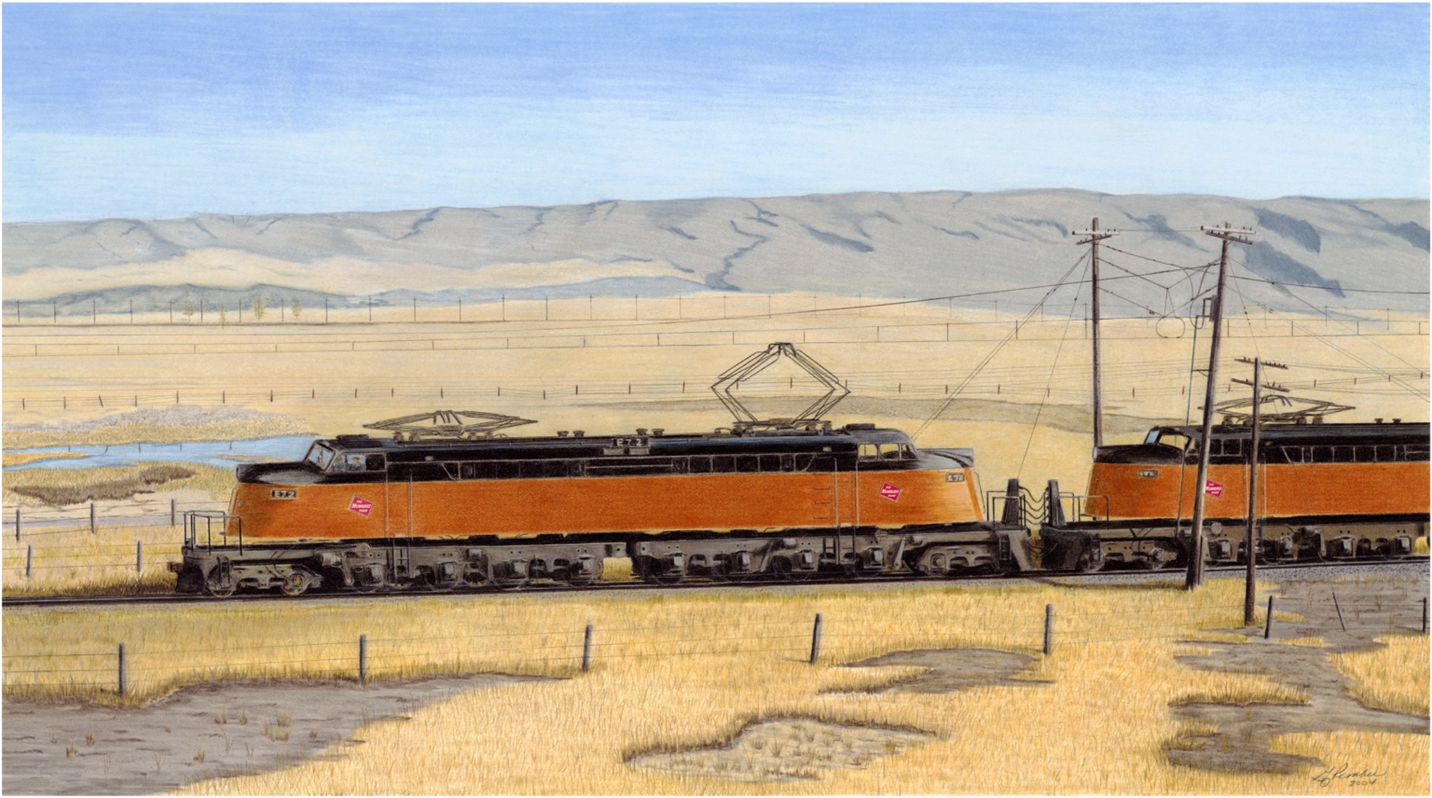 Two Milwaukee Road “Little Joe Electrics” travel through the sweet grass fields near Three Forks, Montana.
